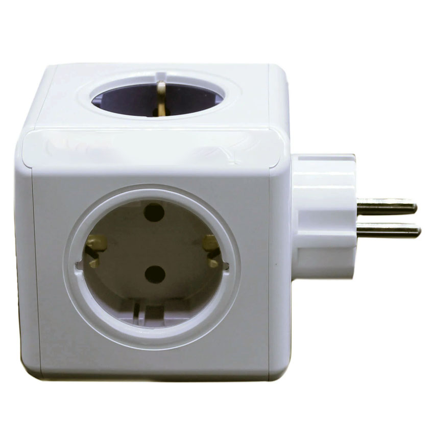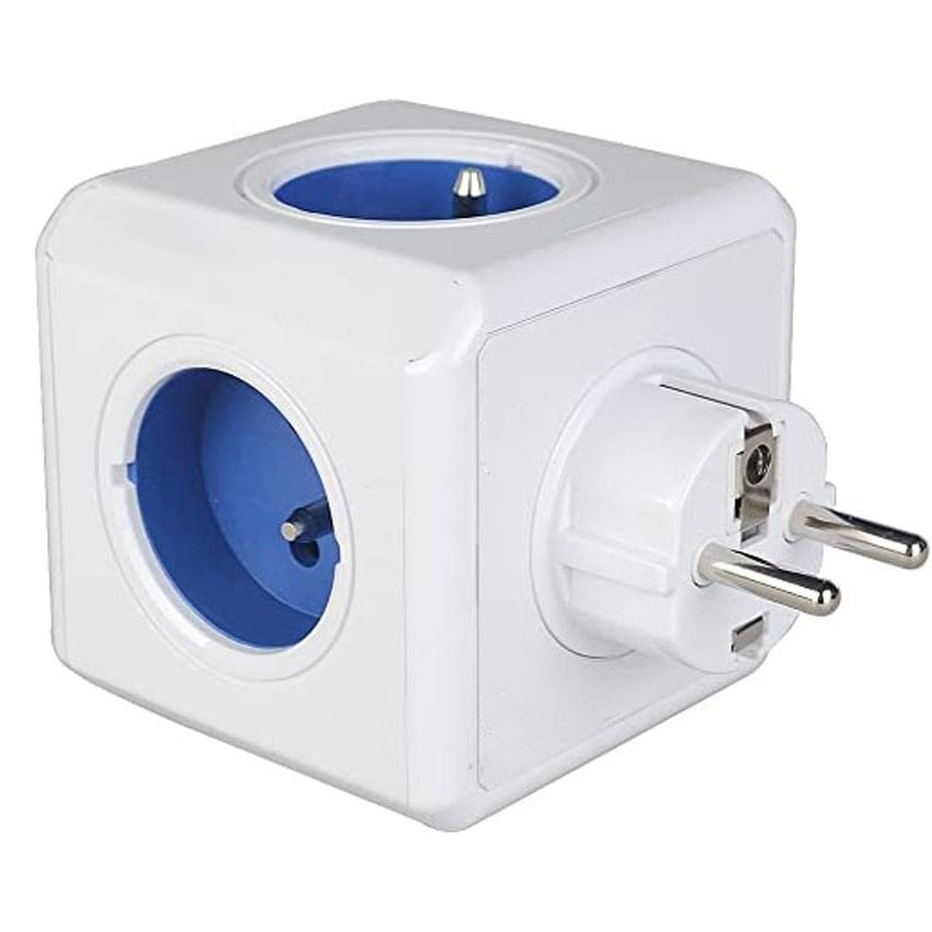 Ladrón multiple, de pared con 4 tomas de enchufe y 2 USB en el frontal. Multiconector de diseño blanco y azul tipo powercube, está desarrollada para aprovechar el espacio y que puedas conectar diferentes aparatos electrónicos a la vez, ya que los enchufes no se obstaculizan entre sí. Con 4 tomas de enchufe hembra, también lleva incorporado 2 puertos USB para que conectes directamente tu Smartphone o Tablet. Se conecta a la corriente mediante shucko macho para una alimentación de entre 100 y 250V. Tiene una intensidad de 16 amperios y una potencia de 3600W. Diseño compacto, práctico y seguro con protección infantil, tiene unas medidas de 8 x 8 cm.