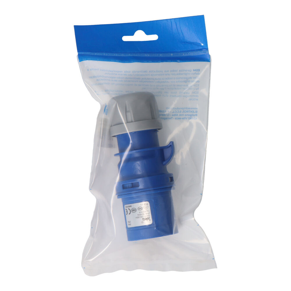 Clavija Azul CETAC 2 P+T 16A (envasada). Ofrece conexiones seguras y fiables. Su diseño práctico es perfecto para electrodomésticos y herramientas, garantizando durabilidad y eficiencia.