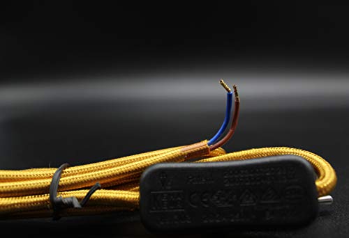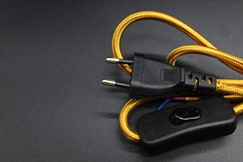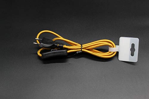 • Cable de conexión textil. Este cable decorativo es ideal para conectar lámparas o aparatos eléctricos. El toque decorativo lo da el cordón recubierto color dorado, con clavija de enchufe color negro. En el centro del cable hay un interruptor de mano también color negro. Es un mecanismo muy fiable y robusto.