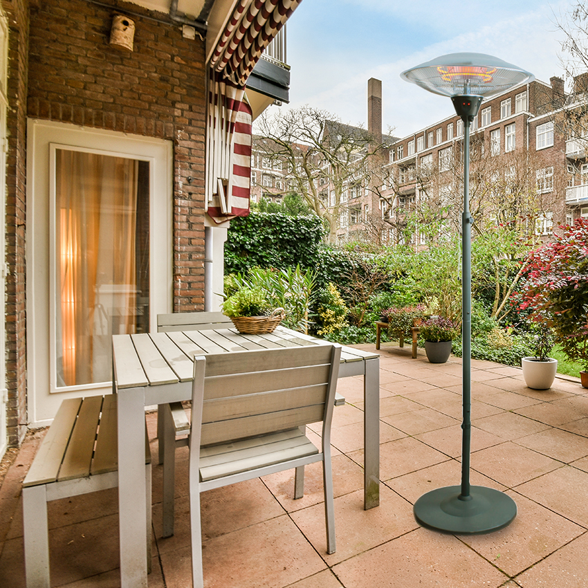 estufa de cuarzo de exterior con pie 2100W, perfecta para calentar tus reuniones al aire libre. Diseño elegante y funcional, ideal para disfrutar del calor en noches frescas.