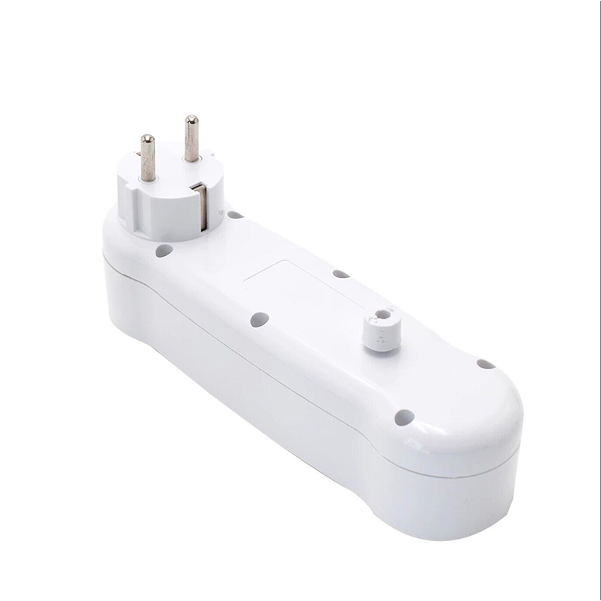 Multiplicador de enchufe. Este adaptador plano, cuenta con tres enchufes e interruptor luminoso on off, está diseñado para eliminar el desperdicio de energía, no hace falta desconectarlo cuando no esté en uso, solo hace falta pasar el interruptor al modo apagado. Hace que todos los aparatos eléctricos conectados funcionen teniendo tres salidas a su servicio. El adaptador es de color blanco, tiene una entrada principal lateral. Su potencia máxima es de 3680W 10 a 16A a 250 Voltios.