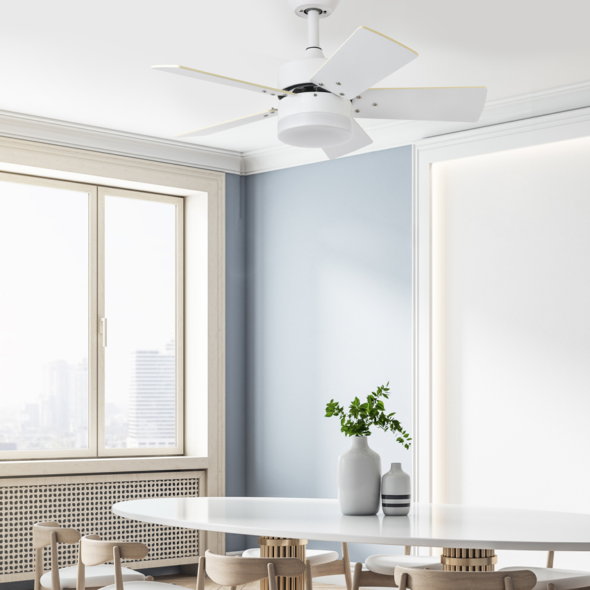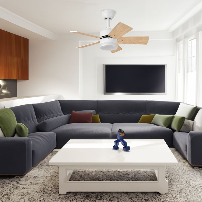 Ventilador blanco, con 5 aspas reversibles blanco/haya y 6 velocidades, con mando a distancia y temporizador, ventilador de 36W temperatura regulable