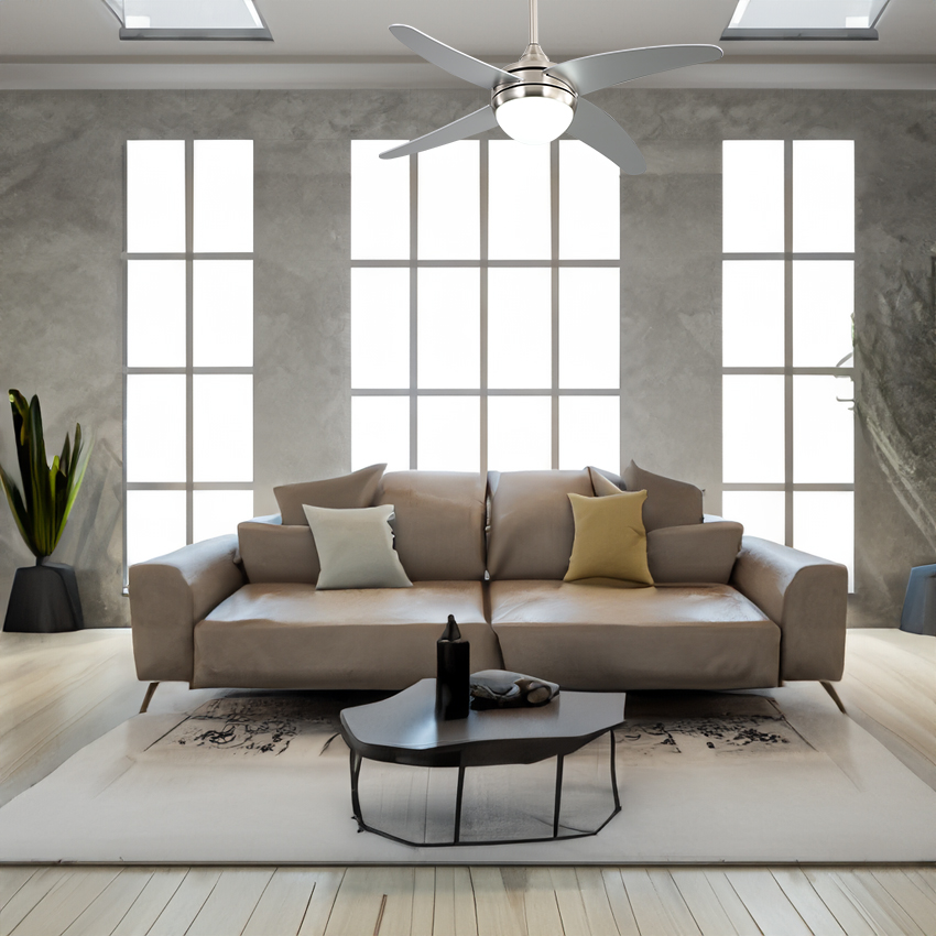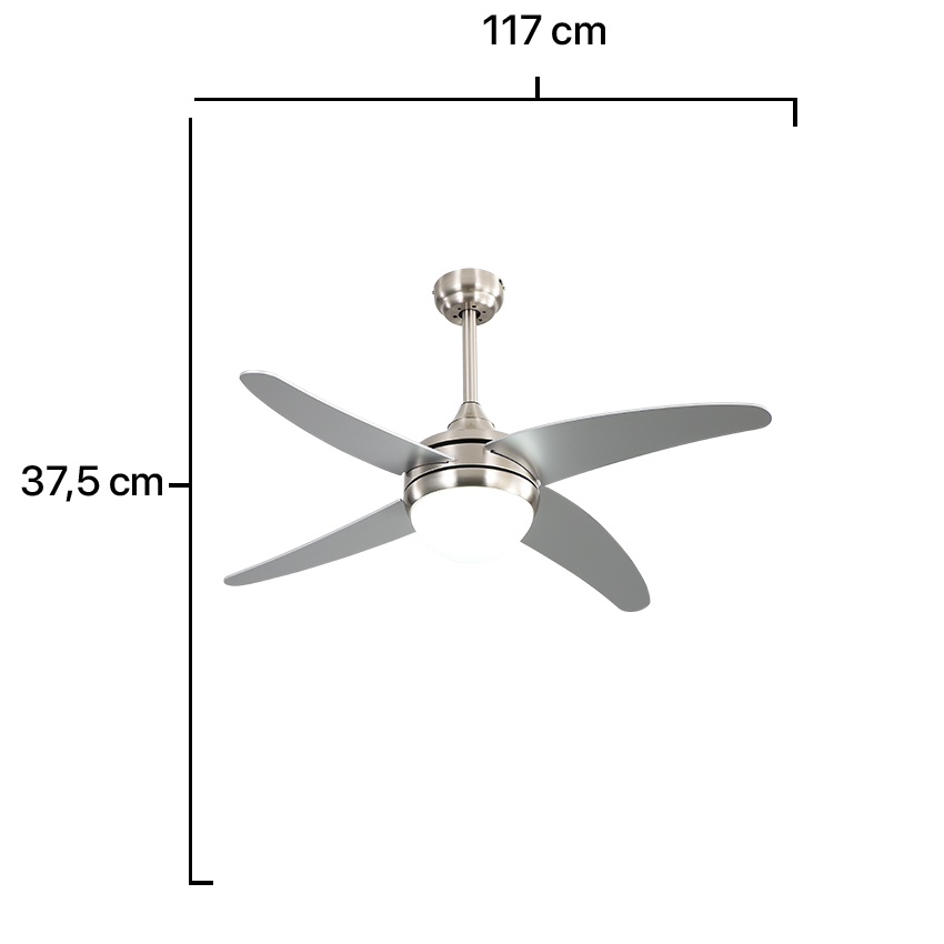Ventilador de techo níquel con 2 casquillos E27, ventilador con 4 aspas color plata 6 velocidades, incluye temporizador y mando a distancia